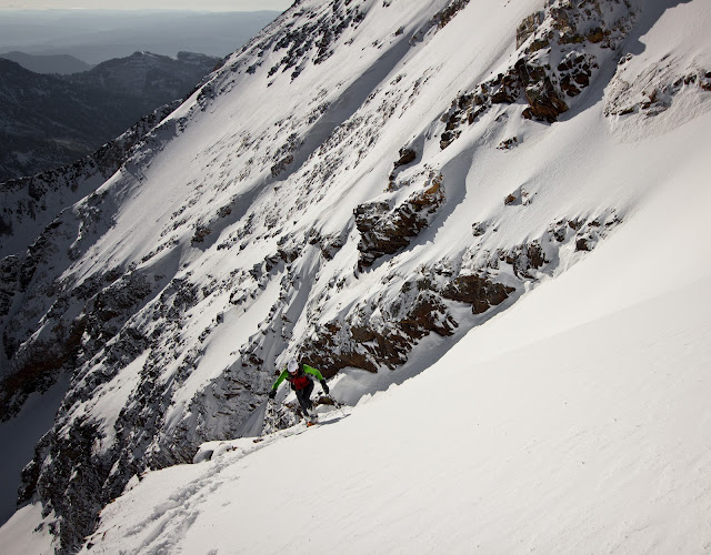 Jason sent the text Sunday night asking if I could ski in the morning. The storms had been brewing in the high mountains over the weekend and I could see a faint dusting of snow on Twin's west face. We couldn't tell how much depth was really there but I knew I had to get another day in the alpine on skis as the ever impending doom of summer was quickly befalling us. Meeting Jason at 5:40 AM is always a treat, he is all smiles and ready to roll towards another objective in the mountains. His boundless energy is so inspiring. We have had some outstanding ski adventures together and this promised to be another one. 6:00 AM we threw our packs on which had minimal water, some food, a down jacket and light crampons and a shovel and speedily found snow about 200 feet from our vehicle. With skis on we made haste and moved efficiently up the ski run of Snowbird resort with our objective looming high above us. The Pipeline Couloir, known for its aesthetic beauty which makes a snake like mark down the northeast face of American Fork Twins West Peak was our aim and with the resort closed for the season and with no one but us, a light breeze, cold temperatures and some moose tracks, we knew the Pipeline was ours. Before we knew it we had reached the bottom of the Little Cloud lift